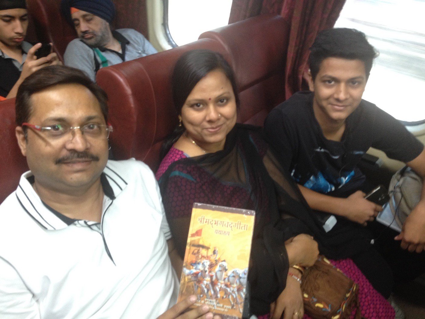 At that moment, the son (sitting on the right) spoke up brightly: “Papa, I think we can have this… I can give Bhagavad Gita to my known friends.”
